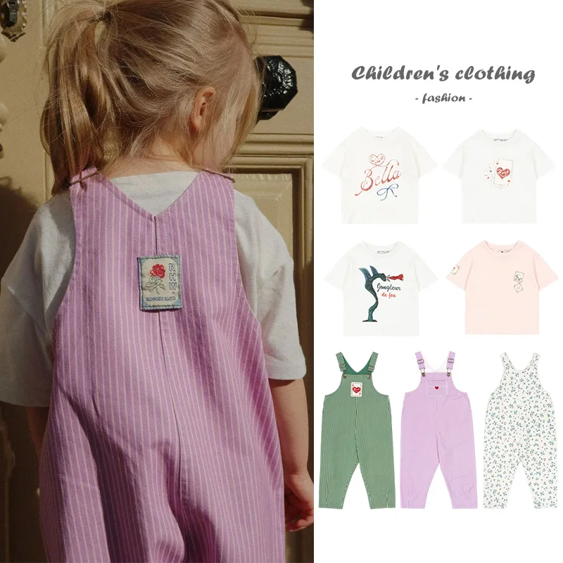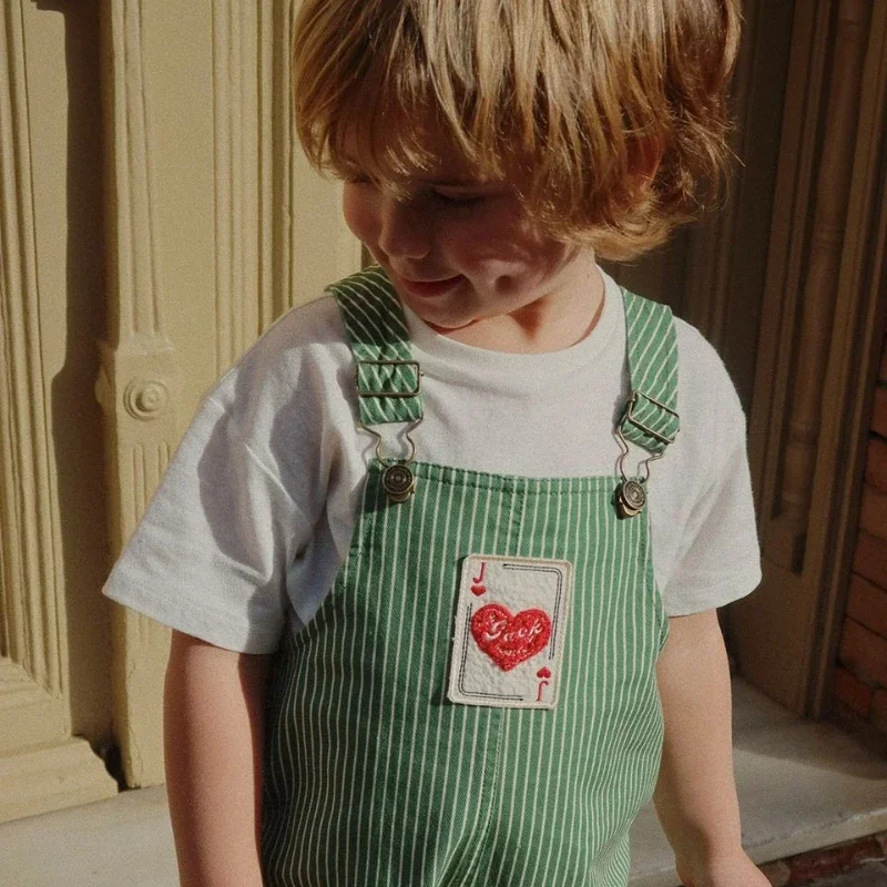 2025 New Striped Children Overalls Summer Poker Printed Boys' T-shirt White Girls' Short Sleeve Top Children's Clothing