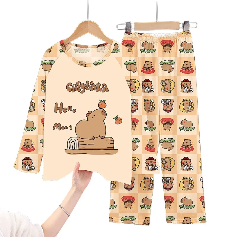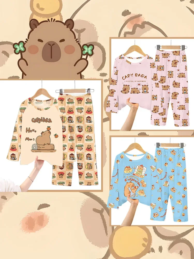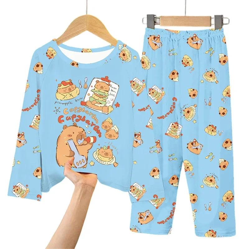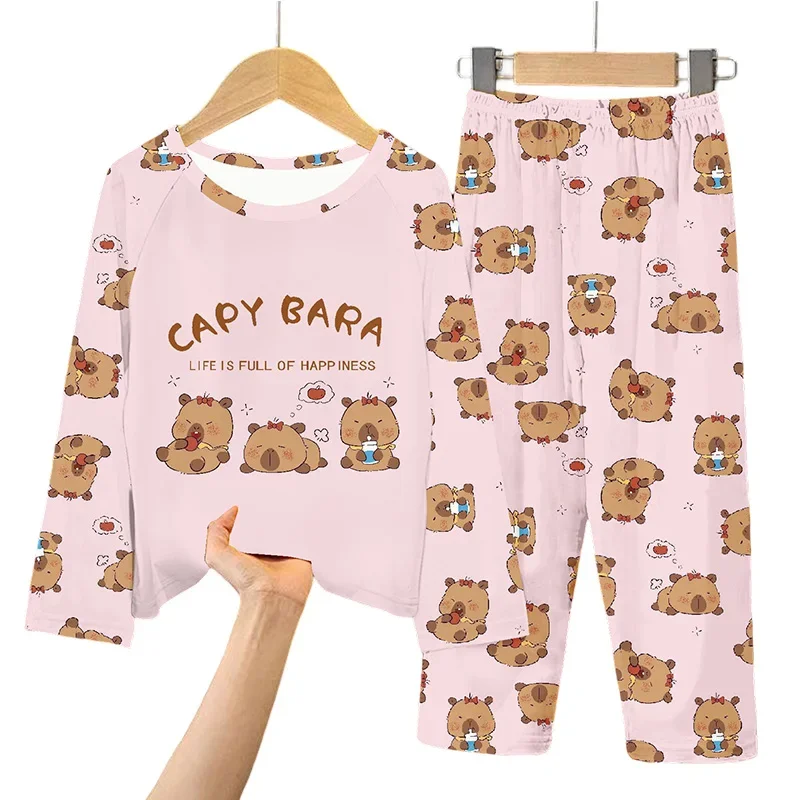 2Pcs Capibara Kids Pajama Sets Long Sleeve Loungewear with Animal Print Soft Sleepwear for Boys/Girls Cartoon Sleep Pants Outfit